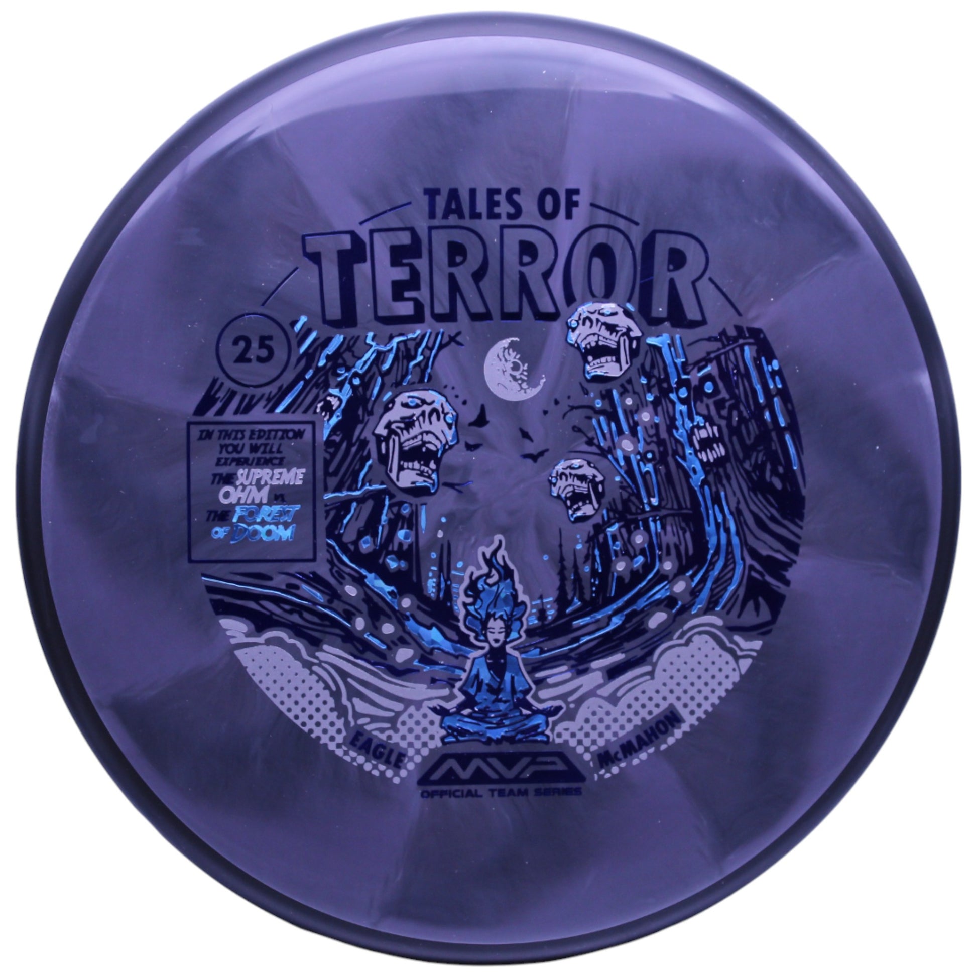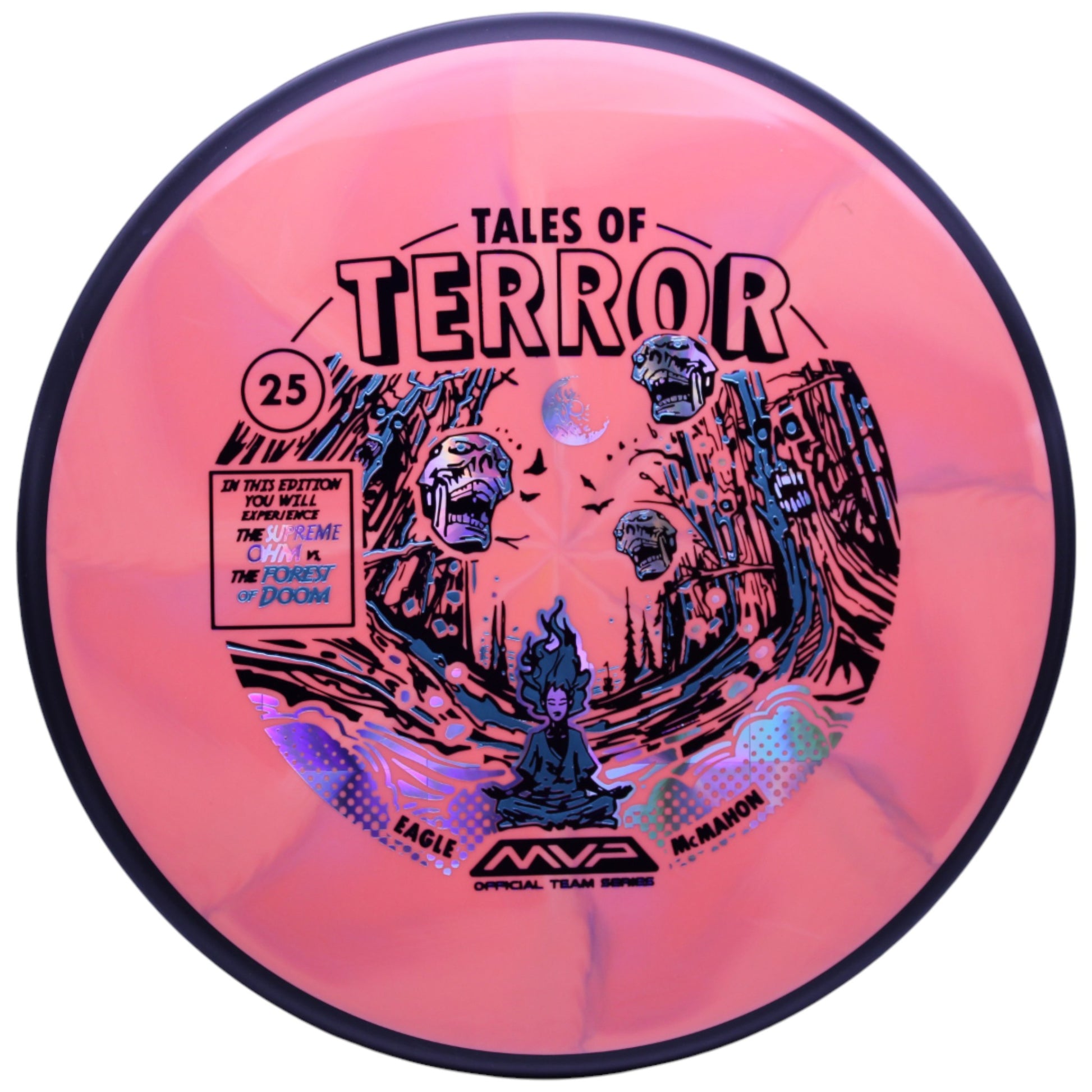 (2, 5, 0, 1) – A Cosmic Neutron putter illustrated by John Dorn, perfect for glide-filled drives and navigating the “Forest of Doom”. Eagle McMahon chose the Ohm for his Halloween signature disc because he loves to nail pure shots through the woods with it.